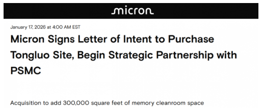 国际电子商情19日讯 近日,美光科技宣布已与力积电签署独家意向书,拟以18亿美元现金收购后者位于中国台湾苗栗县桐洛的P5晶圆厂。该交易包含一座面积达30万平方英尺的300毫米晶圆厂洁净室,预计2026年第二季度完成,届时将显著提升美光的DRAM生产能力。