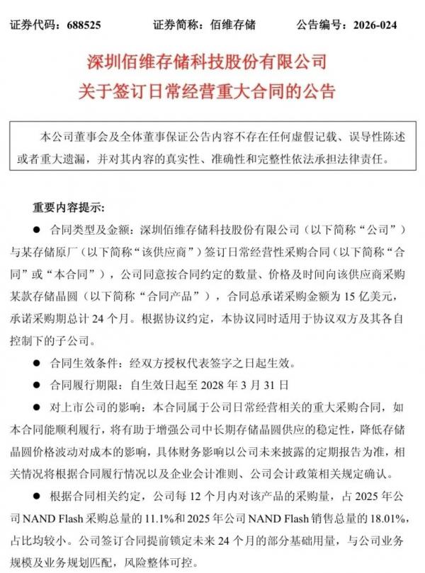 佰维存储(688525.SH)于3月24日发布公告,公司与某存储原厂签署日常经营性采购合同,将按照合同约定的数量、价格及期限向对方采购指定型号存储晶圆。合同总采购金额为15亿美元,承诺采购期限共计24个月,自2026年第二季度起至2028年第一季度止。 本次合同属于公司日常经营业务,合同金额已超过公司上一会计年度经审计营业收入及总资产的50%,且金额超过1亿元,达到信息披露标准。若合同顺利执行,将有利于提升公司中长期存储晶圆供应的稳定性,减少存储晶圆价格波动对公司成本带来的影响。