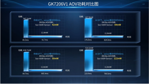 国科微GK7203V1系列在AOV模式下的实测功耗数据显示:在200万像素@1fps的配置下,包含图像传感器在内的单板功耗低至46mW。