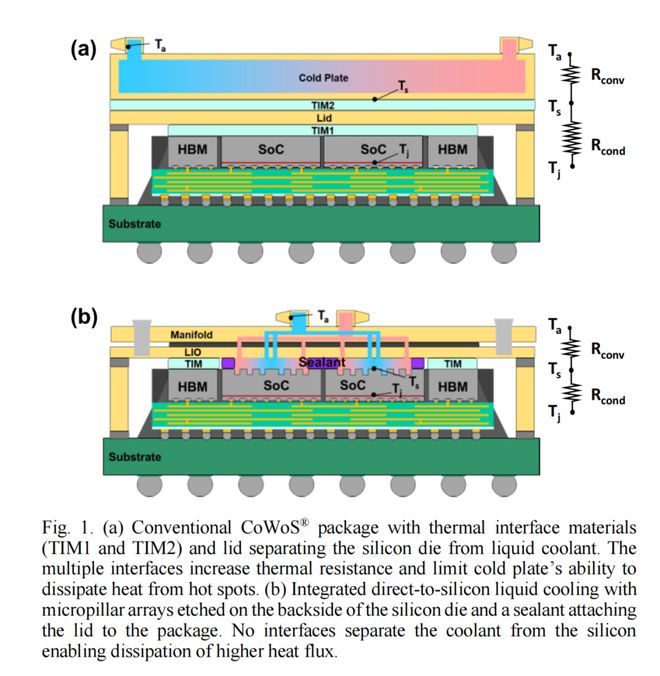 然而,集成系统在高功率密度下散热的能力限制了异构集成未来性能的提升。最简单的情况是,垂直堆叠两个逻辑芯片会使功率密度翻倍。近年来,液冷板因其优于风冷的散热效率而被集成到高性能计算 (HPC) 应用中。然而,如图 1(a) 所示,它们的间接液体冷却方案(包括沿传热路径的热界面材料 (TIM))限制了其在高功率密度应用中的冷却效率。
