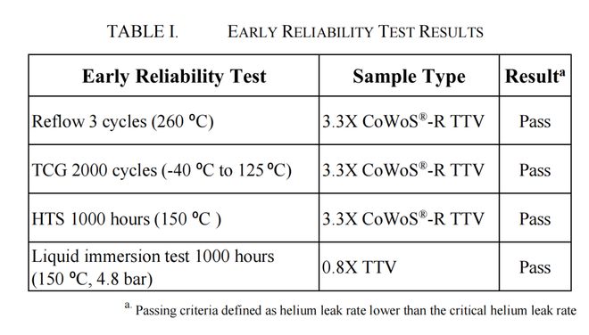 此外,还进行了加速液体浸没测试(150 °C,4.8 bar 压力),以评估密封剂的抗液体泄漏性能。首次成功证明,与 IMC-Si 集成的 CoWoS 是一种可行的解决方案,能够满足日益苛刻的高性能计算/人工智能应用中对热性能和电性能的要求。