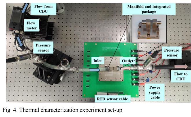 热特性实验是在闭环配置中,使用商用数据中心冷却分配单元 (CDU) 进行的,如图 4 所示。入口处使用 40 °C 的纯水作为液体冷却剂,入口冷却剂与 Tj,max 之间的允许温差 (ΔT) 设置为 60 °C。
