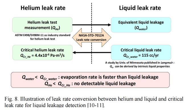 其中 γ 为表面张力,ρ 为密度,g 为重力加速度,φ 为接触角,D 为液体扩散系数,Cs 和 C∞ 分别为空气和环境空气中饱和蒸汽的浓度。利用该公式,数据中心的临界泄漏率 (Qcr_water) 估计为 115 cc/year(水)。Qcr_water 可以转换为临界氦泄漏率 (Qcr_He),其值为 4.4 x 10⁻⁶ Pa·m³/s。换句话说,如果集成封装的氦气泄漏测试结果小于 Qcr_He,则表明不会发生可检测到的液体泄漏。