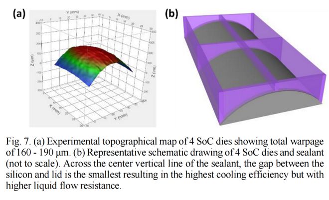 我们之前在 IMC-Si 方面的工作为与 CoWoS 平台的集成指明了方向,即使用可分散的聚合物基粘合剂作为逻辑芯片和歧管盖之间的密封剂。这种弹性体密封剂可以有效缓解大尺寸封装中的翘曲变化,并有助于多芯片密封。