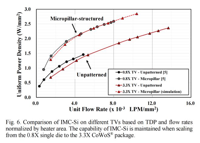 此外,仿真结果表明,如图 5 所示,集成在 SoC 背面的微柱阵列可额外提升 50% 的散热性能。这种提升归因于表面积的增加和湍流的产生。在 10 LPM 的流速下,TDP 可提升至 3.4 kW,从而实现 2.5 W/mm² 的功率密度。我们之前对集成在 0.8X TTV 上的 IMC-Si 的热特性分析结果也支持这一发现。图 6 通过将 TDP 和流速除以加热器面积或单位流速,比较了 0.8X TTV 和 3.3X CoWoS-R TTV 的热性能。对于未图案化表面上的 IMC-Si 液冷,0.8X TTV 和 3.3X TTV 的性能曲线相似。例如,在单位流速为 5 x 10⁻³ LPM/mm² 时,两种 TTV 的功率密度约为 1.5 W/mm²。当在 SoC 背面形成微柱阵列时,3.3X TV 的仿真结果与 0.8X TV 的实验数据几乎完全重合。这表明,从 0.8X 单芯片扩展到 3.3X CoWoS 平台时,IMC-Si 的冷却能力得以保持。