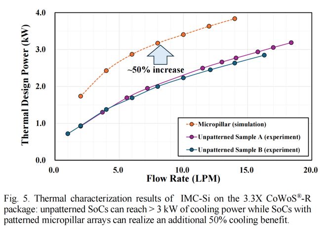 图 5 展示了 3.3X CoWoS-R 封装上 IMC Si 在不同流速下均匀热流的热特性测试结果。在总流速为 5.6 LPM(每个 SoC 约 1.4 LPM)的情况下,直接对 SoC 背面(未图案化,且无微柱阵列)进行硅液冷,四个 SoC 的总冷却能力可达 1.7 kW。由于无需 TIM 层及其相关的热阻,冷却液能够更有效地散热。此外,在达到“收益递减”点之前,通过 IMC-Si 进行直接液冷可以提升较高的流速下的散热性能,之后流速的进一步提升带来的收益将非常有限。当总流速提升至 11.5 LPM 时,TDP 提升至 2.5 kW,功率密度达到 1.9 W/mm²。相比之下,间接冷却系统(例如冷板)在流量显著降低的情况下,其热性能往往就会达到饱和。间接液体冷却系统的总热阻受限于多个中间表面的传导热阻。