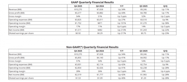 2025财年,AMD营收346亿美元,同比增长34%,创历史新高纪录;营业利润为78亿美元;净利润(Non-GAAP)68.3亿美元,同比增长26%;EPS 则为4.17 美元。