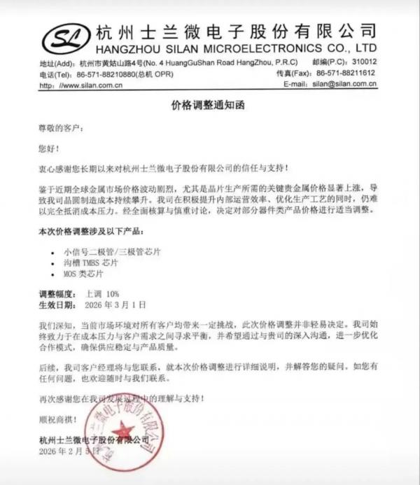近日,杭州士兰微电子股份有限公司(以下简称 “士兰微”)向客户发布《价格调整通知函》,宣布因全球金属市场价格波动、关键贵金属成本持续攀升,将对部分器件类产品价格进行上调,调整幅度为 10%,自 2026 年 3 月 1 日起正式生效。