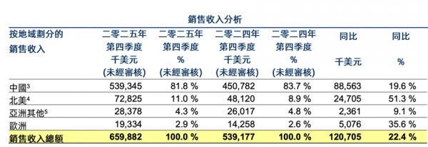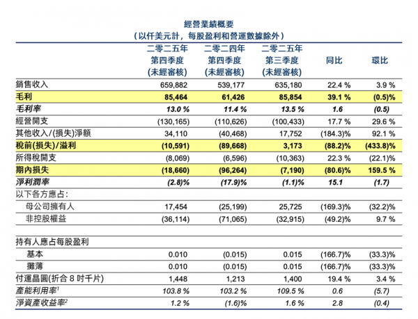 华虹董事会主席兼总裁白鹏博士对二零二五年第四季度及全年业绩评论道:“华虹半导体二零二五年第四季度销售收入再创历史新高,达6.599亿美元,单季度毛利率为13.0%,均符合指引预期。二零二五年全年,公司实现销售收入24.021亿美元,毛利率为11.8%,同比均实现增长并符合管理层预期。在全球半导体市场受AI及其相关产品需求拉动、国内消费类需求回暖的背景下,公司产能维持高位运行,全年平均产能利用率为 106.1%,处于晶圆代工企业领先水平。”