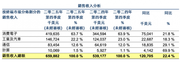 按照终端市场划分,本季度消费电子作为我们的第一大终端市场,贡献销售收入4.196 亿美元,占销售收入总额的63.7%,同比增长21.8%,主要得益于其他电源管理、MCU及闪存产品的需求增加;本季度工业及汽车产品销售收入1.467亿美元,同比增长18.3%,主要得益于其他电源管理及智能卡芯片的需求增加;本季度通信类产品销售收入8,350万美元,同比增长29.1%,主要得益于CIS、RF、智能卡芯片及模拟产品的需求增加;本季度计算类产品销售收入1,010万美元,同比增长69.9%,主要得益于通用MOSFET及MCU产品的需求增加。