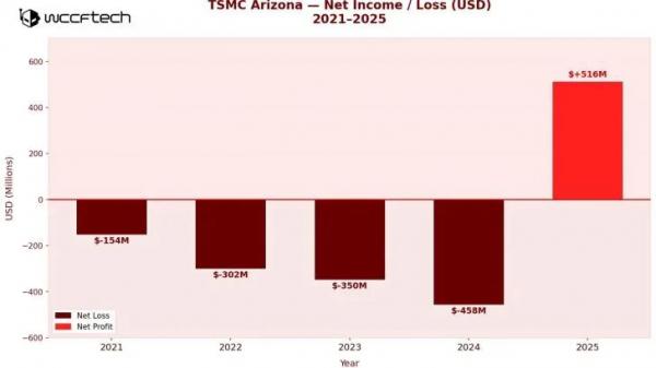 3月1日消息,根据晶圆代工大厂台积电披露的2025年度报告显示,自2021年-2024年的四年间,台积电亚利桑那州晶圆厂(TSMC Arizona)累计亏损12.6亿美元。但是在2025年,台积电亚利桑那州晶圆厂就扭亏为盈,并获利高达161.4亿新台币(约合5.16亿美元,35.27亿人民币)。