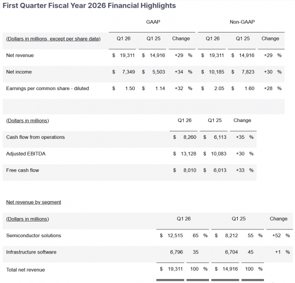 财报显示,博通第一季合并收入同比增长29%至193亿美元,高于分析师预期的192.6亿美元,并创下历史新高;经调整后的 EBITDA(利息税折旧摊销后利润)同比增长30%至131亿美元,创历史新高;经调整每股盈余2.05美元,优于分析师预期的2.03美元。