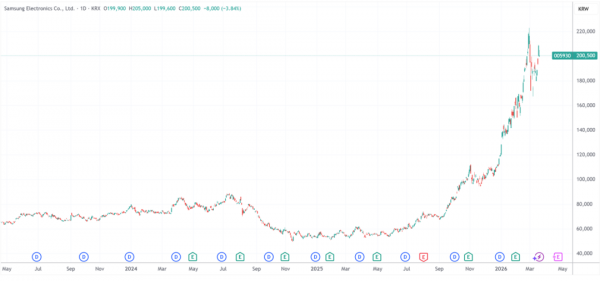 从去年夏天开始,三星电子的股价翻了近4倍。