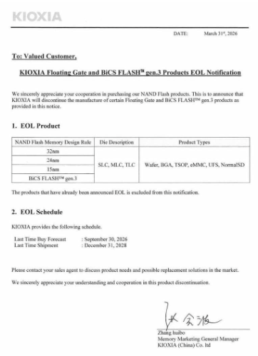 国际电子商情2日讯 从市场渠道获悉,2026年3月31日,存储芯片制造商铠侠(Kioxia)向客户发布最新停产通知,宣布将逐步退出传统浮栅式(Floating Gate)2D NAND闪存市场。