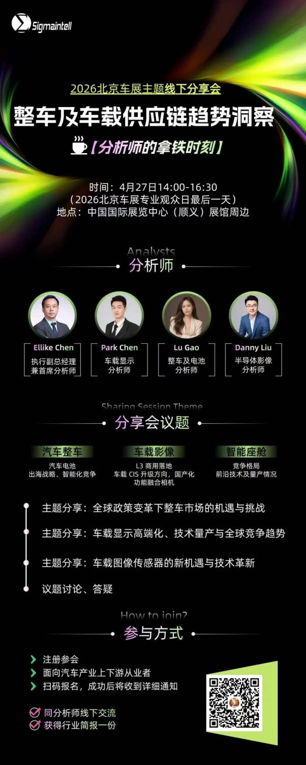 2026 北京车展同期,#群智咨询(Sigmaintell)「分析师的拿铁时刻」首期活动,邀你以咖啡为媒,围坐畅谈整车及车载供应链核心趋势。