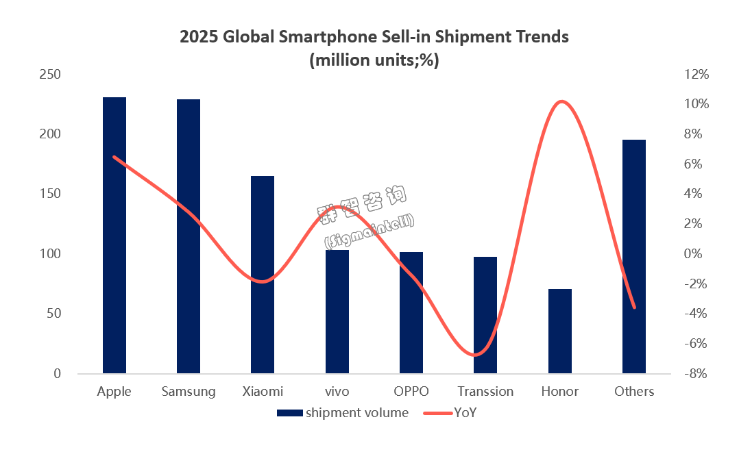 Samsung, leveraging its vertically integrated supply chain including self-developed memory and chipset solutions, effectively mitigated supply chain risks and ensured stable production and supply. According to data from #Sigmaintell, Samsung shipped approximately 230 million units globally in 2025, an increase of 2.8% year-on-year.