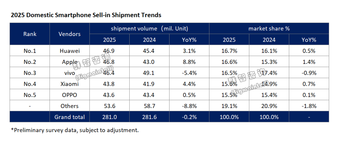 The domestic smartphone shipments of Huawei in 2025 reached approximately 46.9 million units, making it the top player in the Chinese market by shipment volume. In the first half of the year, the performance of the Pura 80 series fell short of expectations, hampered by compatibility limitations of the HarmonyOS NEXT. In the second half, against an industry backdrop where mainstream brands generally raised product prices, Huawei promptly adjusted its pricing strategy and launched the Mate 80 series with a lower starting price. This highly competitive pricing effectively boosted its market performance, successfully securing its position as the annual shipment leader in the domestic Chinese smartphone market.