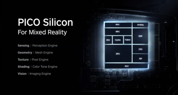 更具战略意义的是 PICO Silicon 自研专用芯片的落地。这款历时三年研发、2022 年 6 月立项的芯片,集成多项定制化计算单元,专门聚焦实时感知、空间计算与成像处理等核心任务。通过芯片级感知与成像引擎,能够低延迟解析融合多传感器数据,实现超高画质呈现、毫米级精准定位及稳定的头动眼动追踪,将系统端到端延迟压缩至 12 毫秒。这一指标不仅大幅超越行业主流的 25 毫秒水平,更有效降低了晕动症风险,让虚实交互更自然流畅。