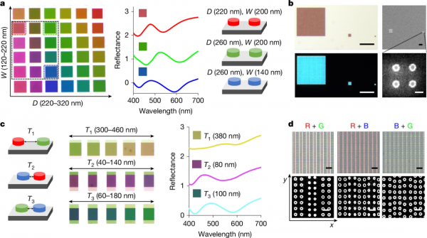 a、超像素设计。左图:调整WO₃纳米盘的D和W可实现多样化的调色板。虚线框突出显示选定的 RGB 像素及其中间区域,其中包含 CMY 像素。中间:所选 RGB 像素的反射光谱。右图:所选RGB 像素对应的D和W值。b、微观和结构表征。左图:在 ×100 放大倍数下捕获的特征尺寸为 20 μm、2 μm 和 420 nm 的红色像素的明视野(顶部)和暗视野(底部)显微镜图像。比例尺,10 μm。右图:2 μm 和 420 nm 红色像素的 SEM 图像。比例尺,2 μm(顶部)和 200 nm(底部)。c 、通过子像素排列进行颜色混合。左图和中间:相邻 RGB 子像素之间的反射颜色随T而变化。右图:混合 CMY 像素的反射光谱,对应于优化的子像素间距。d . 高分辨率彩色成像。上图:混合CMY像素的明场显微镜(×100)图像。比例尺,1 μm。下图:相应混合像素的SEM图像。比例尺,500 nm。