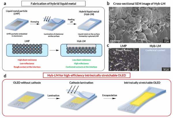 图1. 混合液态金属阴极的制备流程及其在本征可拉伸OLED中的应用