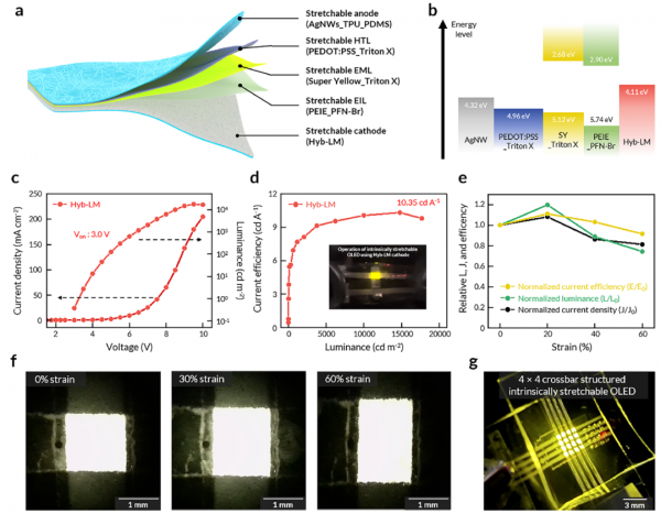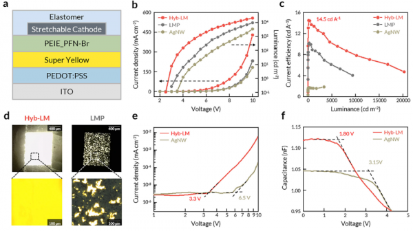 为充分发挥Hyb-LM阴极的性能优势,研究团队设计了全拉伸器件架构,各层材料均经过拉伸性与能级匹配优化:a. 阳极:AgNW嵌入TPU-PDMS复合基质,兼具高导电性与拉伸稳定性;b. 空穴传输层:添加5 wt.% Triton X 的PEDOT:PSS,提升材料拉伸性与界面相容性;c. 发光层:添加Triton X的Super Yellow(SY)聚合物,具备良好的拉伸恢复能力;d. 电子注入层:PEIE与PFN-Br的共混物,不仅具备高拉伸性,还能将Hyb-LM阴极的工作函数进一步降低,大幅减小电子注入势垒;e. 阴极:Hyb-LM双层结构,与电子注入层形成良好能级匹配。