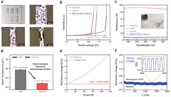 然而,传统柔性阴极材料均存在致命缺陷:a. 银纳米线(AgNW)、碳纳米管等碳基材料:工作函数高,电子注入效率低,且拉伸过程中电阻变化显著,反射率不足10%,影响器件亮度与出光效率;b. PEDOT:PSS等导电聚合物:工作函数高,电子注入障碍严重,机械强度差,长期拉伸易失效;c. 液态金属(如镓铟共晶合金,EGaIn):虽具备低工作函数和优异拉伸性,但存在两大难题 —— 喷雾沉积时氧化层会阻碍电子注入,且高表面张力导致图案化困难,无法满足高分辨率器件需求;d. 液态金属颗粒(LMP):离散的颗粒形态导致界面接触不良, 面电阻很高,反射率极低,难以实现高效电荷传输与光提取。