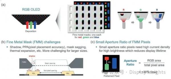 图1.导致PDL尺寸扩大的因素:(a) OLED蒸镀工艺;(b) FMM在像素定位精度方面的挑战,源于FMM开口与子像素开口的错位。其中阴影由FMM台阶高度与基板之间的间隙造成:PDL > 2×PPA + 阴影;(c) FMM像素的小开口率