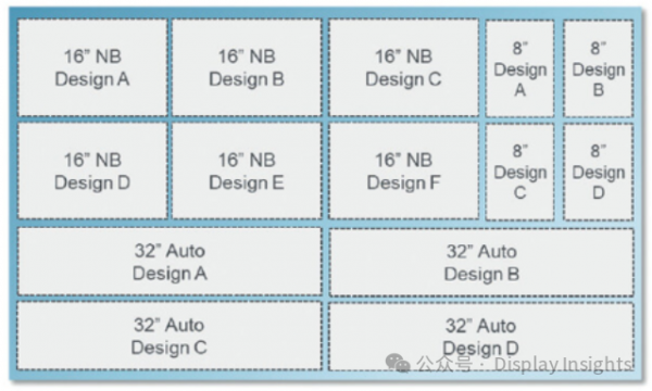 除了交付周期和成本优势外,基于光刻的MAX OLED图案化还允许在单个基板上排版多种产品和设计。如下图5展示了这一概念示例:16英寸产品有六种不同设计,8英寸产品有四种不同设计,32英寸产品有四种不同设计。通过这种方法,面板厂可以在单个产品的制造批次中开发和验证多种产品和设计。这些优势能够缩短产品上市时间,加快当前OLED新产品和技术的开发步伐。