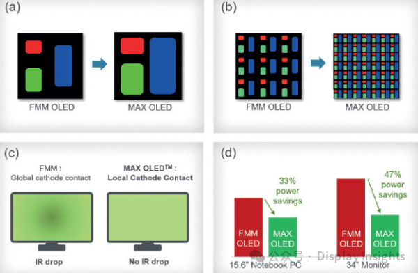 图4. FMM和MAX OLED技术方案的性能比较:(a) 开口率;(b) 像素密度;(c) IR 降;(d)功耗