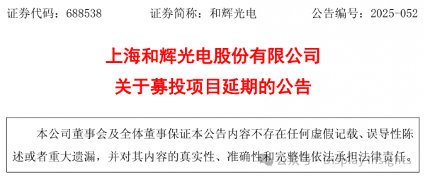10 月 31 日,上海和辉光电股份有限公司(证券代码:688538,证券简称:和辉光电)发布公告,宣布将首次公开发行股票募投项目 “第六代 AMOLED 生产线产能扩充项目” 的预定可使用状态时间,由原计划的 2025 年 12 月延期至 2026年 9 月。本次延期不改变项目实施主体、方式及投资总额,也未调整募集资金投向,不会对公司生产经营产生重大不利影响。