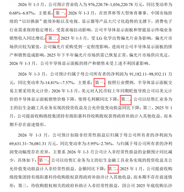 报告中惠科表示,公司预计 2026 年1-3 月营业收入预计达到 976,220.78 至 1,036,220.78 万元,同比增长 0.68% 至 6.87%;归母净利润预计为 91,182.11 至 98,932.11 万元,同比变动幅度为 - 14.81% 至 - 7.57%;扣非净利润预计为 69,631.31 至 76,081.31 万元,同比变动幅度在 - 5.95% 至 2.76% 之间。