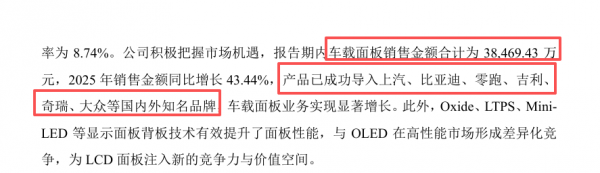 从订单结构来看,在手订单主要集中于大尺寸 TV 面板、IT 面板及新兴应用领域产品,与全球显示行业大尺寸化、高性能化的发展趋势高度契合。在新兴应用领域,公司车载面板业务表现亮眼,已成功导入上汽、比亚迪、零跑、吉利、奇瑞、大众等国内外知名品牌,报告期内车载面板销售金额合计38469.43万元,同比增长43.44%。