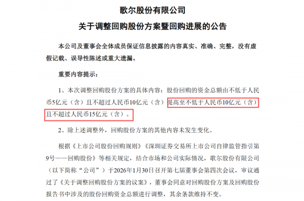 公告显示,歌尔股份于 2026 年 1 月 30 日召开第七届董事会第四次会议,审议通过了调整回购股份方案的相关议案。本次调整仅涉及回购资金总额,具体为将原方案中不低于 5 亿元且不超过 10 亿元的资金总额,提高至不低于 10 亿元且不超过 15 亿元。回购股份方案的其他内容均保持不变。