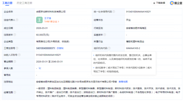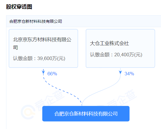 企查查显示,合肥京仓新材料科技有限公司位于安徽省合肥市瑶海区,成立于2026年3月31日,注册资本为6亿元人民币,法定代表人为王子涛。京东方全资子公司北京京东方材料科技有限公司持股66%,大仓工业持股34%。