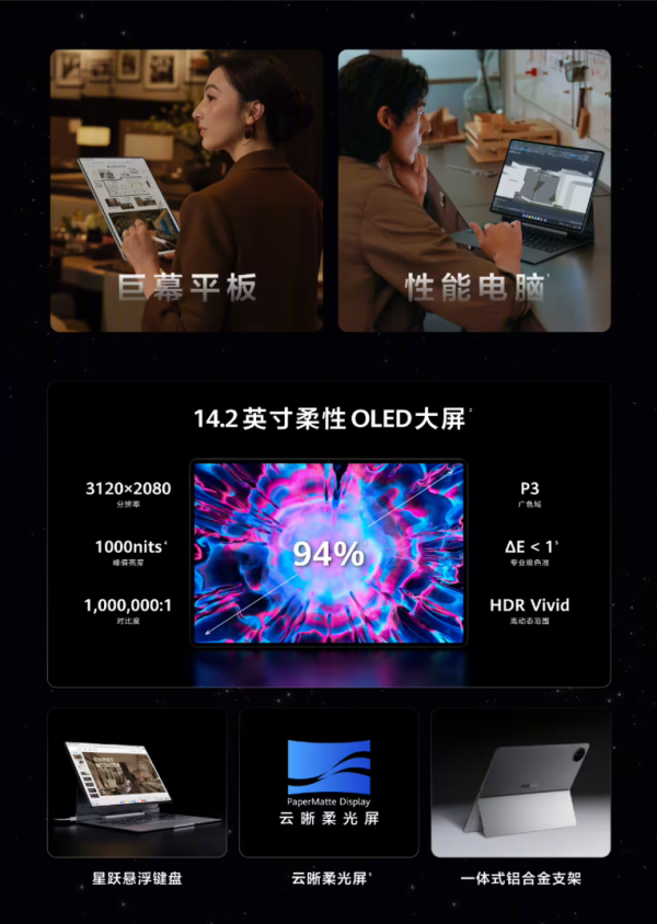 华为 MatePad Edge 搭载了一块 14.2 英寸的柔性 OLED 屏幕,采用 3.1K(3120 x 2080)高分辨率,支持 120Hz 高刷新率,屏占比高达 94%,边框仅为 4.1mm;为了解决办公场景下的反光与护眼问题,该屏幕采用了云晰柔光屏技术,结合纳米蚀刻与纳米磁控增透技术,有效消除了屏幕闪点,并获得了德国莱茵 TÜV Eye Comfort 3.0 认证。
