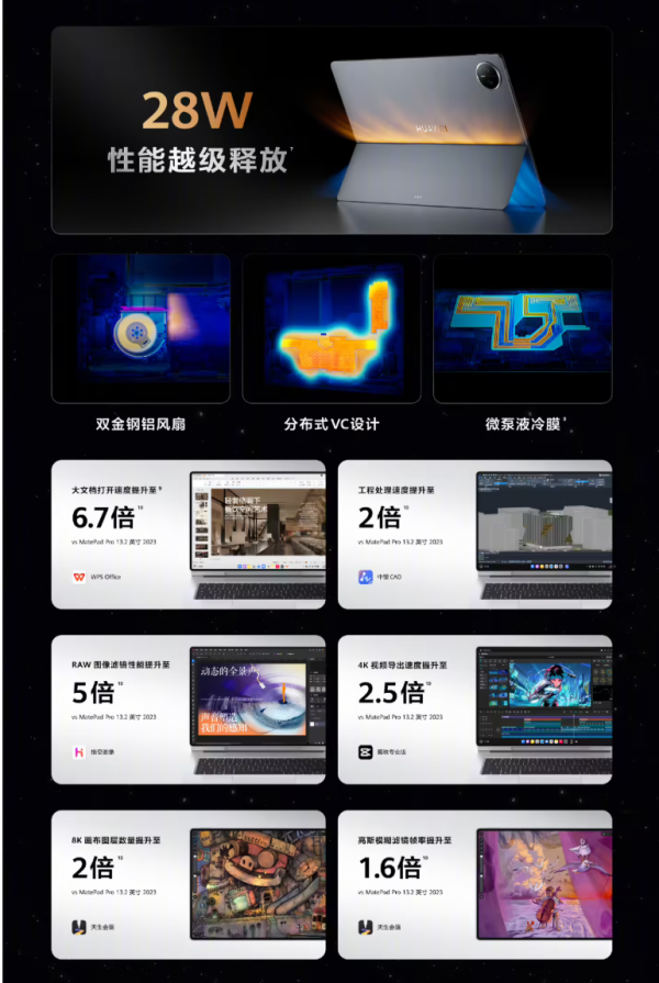 为了在轻薄的机身中实现高性能输出,华为引入了创新的散热架构,配备了贯穿式出风腰线和近 4000 个风孔,内置双风扇与双 VC(均热板),并采用了微泵液冷膜技术,实现了 28W 的性能释放能力。