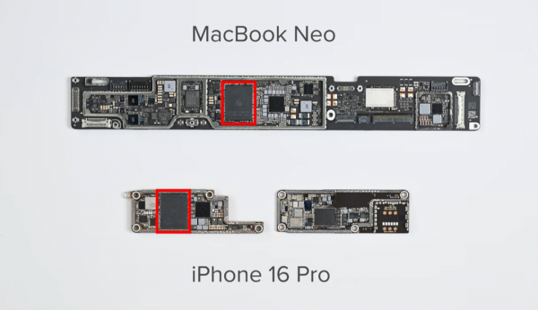 △上面是 MacBook Neo的主板,下面是 iPhone 16 Pro 的主板。红色矩形内都是 APL1V07 芯片(A18 Pro),它们的尺寸和型号名称都一样,封装看起来也一样,但在GPU核心数上存在细微差别。