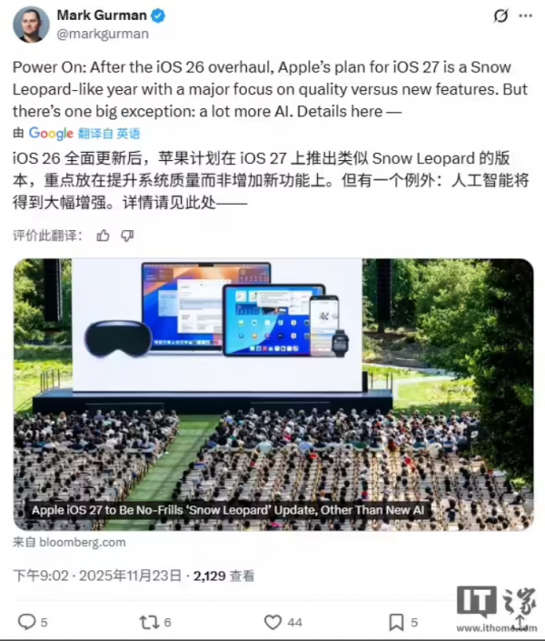 IT之家 11 月 23 日消息,彭博社记者马克・古尔曼(Mark Gurman)刚刚发布了最新一期 Power On 时事通讯。
