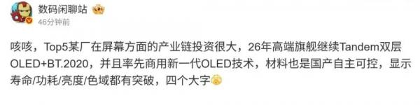 2月3日消息,近日,数码博主“数码闲聊站”爆料称,Top5某手机厂商在屏幕方面的产业链投资很大。