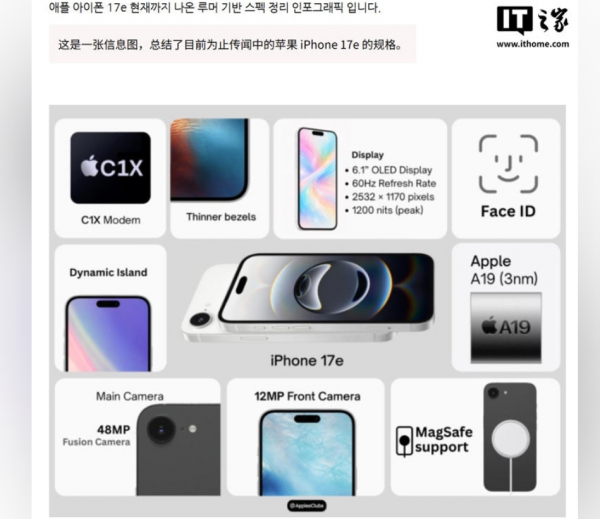 IT之家 2 月 5 日消息,科技媒体 Mac World 昨日(2 月 4 日)发布博文,报道称配件制造商流出的消息显示,苹果有望于 2 月 19 日(周四)通过新闻稿形式,发布 iPhone 17e。