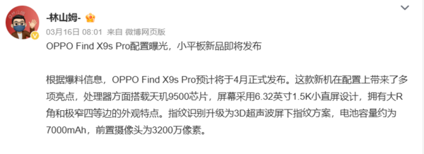 性能方面,OPPO Find X9s Pro预计将搭载联发科天玑9500旗舰芯片。