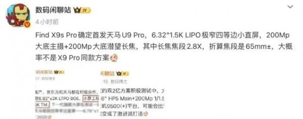 其他产品细节方面,OPPO Find X9s Pro确定首发天马U9 Pro,6.32"1.5K LIPO极窄四等边小直屏,200Mp大底主摄+200Mp大底潜望长焦,其中长焦焦段2.8X,折算焦段是65mm±,大概率不是X9 Pro同款方案。