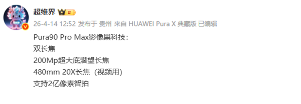 此外,有博主透露,华为Pura 90 Pro Max将搭载双长焦影像系统。分别为2亿像素的超大底潜望式长焦镜头与一颗专门用于视频拍摄的480mm等效焦距长焦镜头。