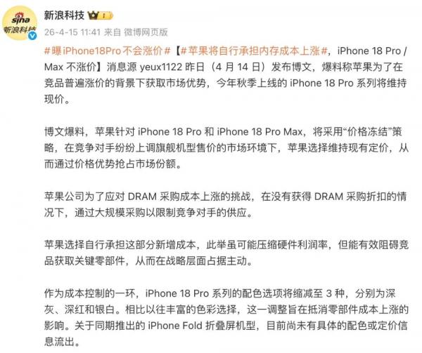 同样来自新浪科技的报道显示,“苹果针对 iPhone 18 Pro 和 iPhone 18 Pro Max,将采用‘价格冻结’策略,在竞争对手纷纷上调旗舰机型售价的市场环境下,苹果选择维持现有定价,从而通过价格优势抢占市场份额。”