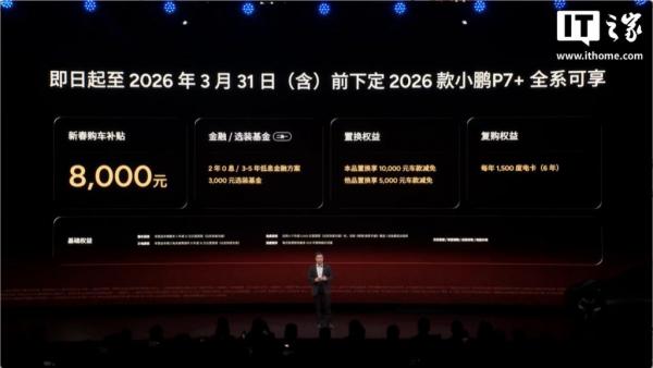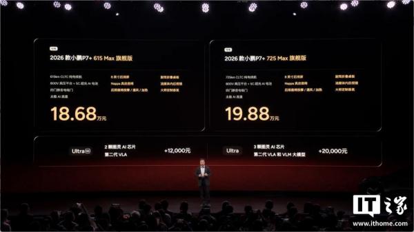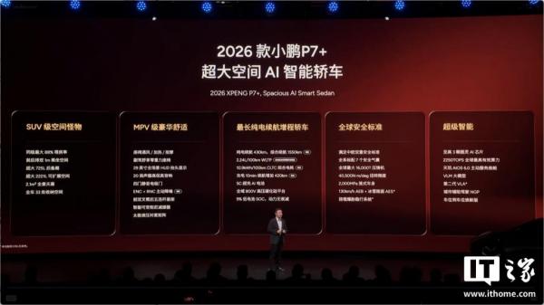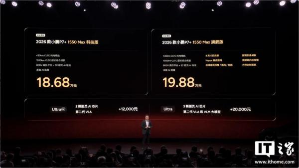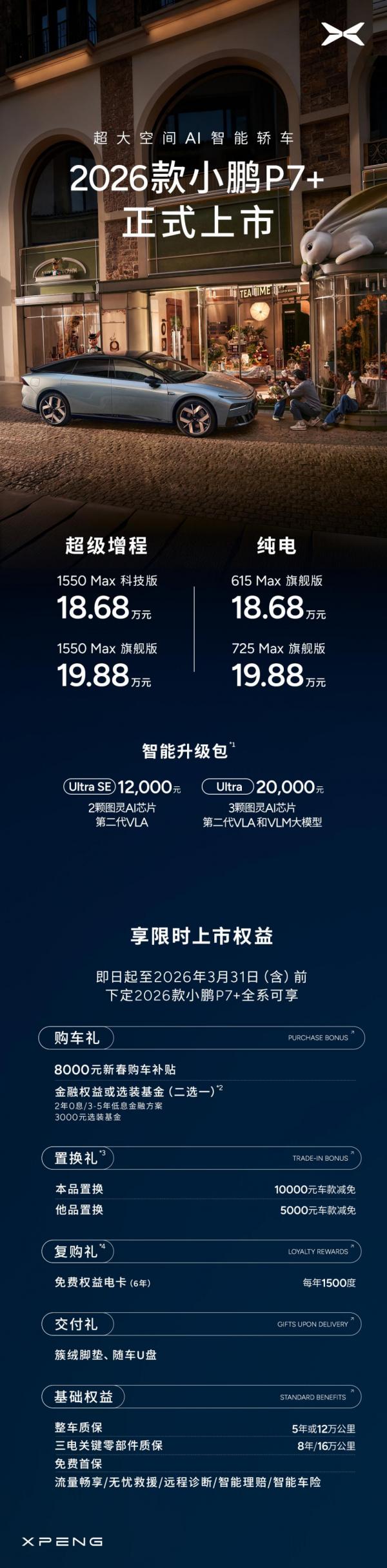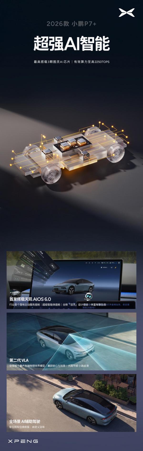 IT 之家 1 月 8 日消息,2026 款小鹏 P7+ 上市,共推出四款配置车型,提供纯电和增程两种动力形式。新车搭载第二代 VLA 技术,有效算力达到 2250TOPS,指导价为 18.68 万至 19.88 万元。