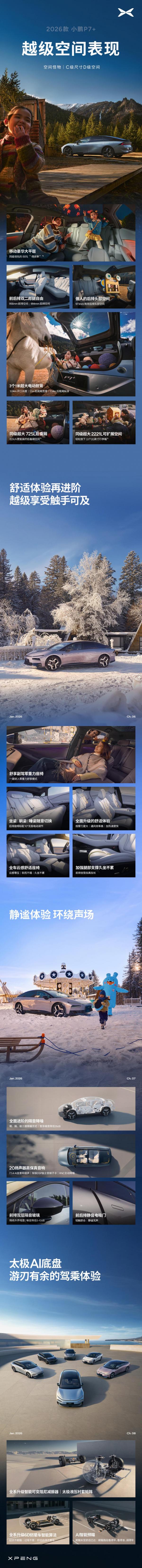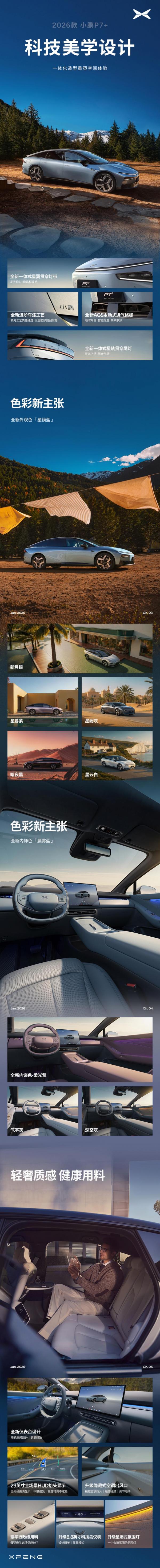 车内配置方面,2026 款小鹏 P7+ 车顶配备一体式穹顶全景天幕,尾门采用电动掀背式设计,后备厢容积在二排放倒后可扩展至 2200 升以上。车内标配母婴级环保材料、Microfiber 超纤绒顶棚、前排双层隔音玻璃及后排隐私玻璃。舒适性配置包括前排静音电吸门、电容感应方向盘、方向盘加热、前排座椅通风加热按摩及主驾座椅记忆等功能。高配车型还增加了 Nappa 真皮座椅、后排座椅电动调节、通风加热按摩功能、副驾后折叠桌板、智能香氛系统及 9 英寸流媒体内后视镜等豪华配置。信息娱乐系统标配 20 扬声器 Xopera 音响、双 50W 无线快充等。