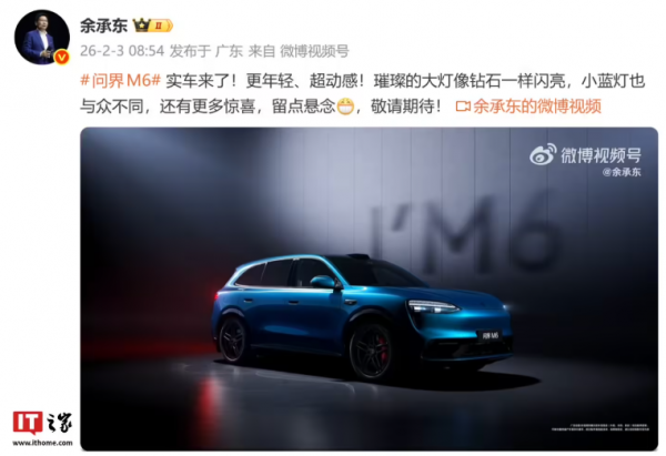 IT之家 2 月 3 日消息,华为常务董事兼终端 BG 董事长余承东今天在微博发文,晒出问界 M6 的实车视频。