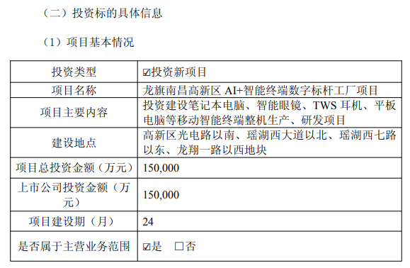 南昌龙旗为本次项目的实施主体,拟出资约150,000万元建设该项目,出资占比100%。公司通过全资子公司上海龙旗信息技术有限公司持有南昌龙旗100%股权。