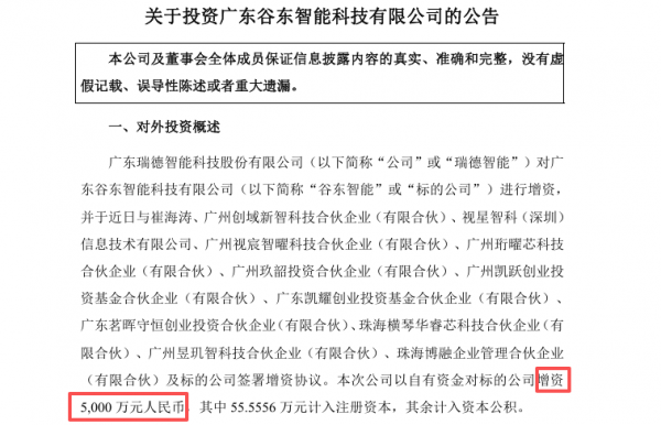 3月5日晚间,国内 AR 光学底层技术企业广东谷东智能科技有限公司(下称 “谷东智能”)宣布获得瑞德智能5000 万元增资,其中 55.5556 万元计入注册资本,剩余部分计入资本公积。本次增资完成后,瑞德智能将持有谷东智能 10% 的股权。