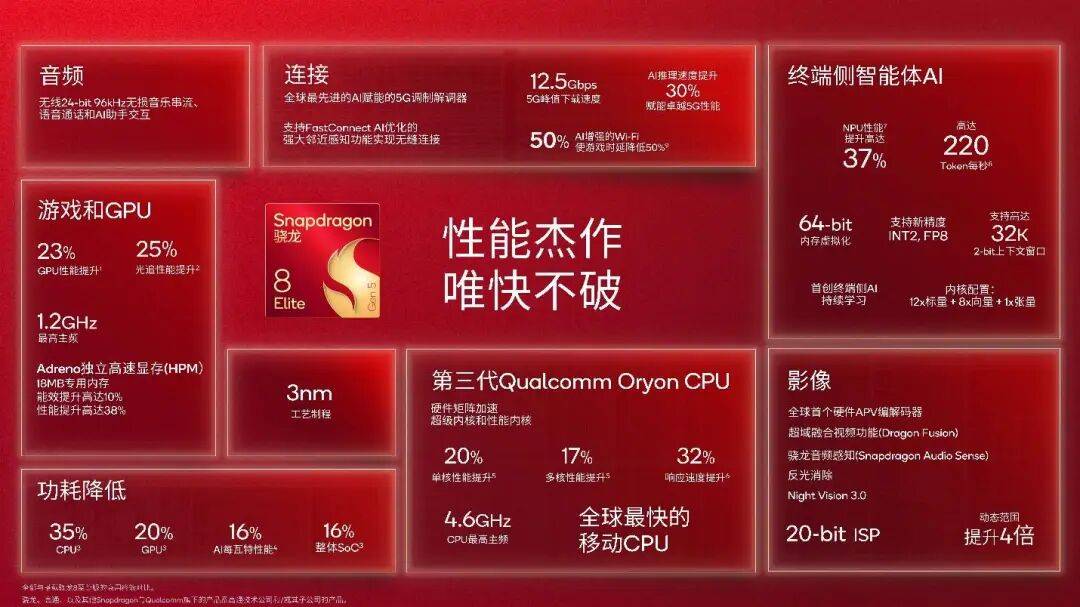 单从主频上看提升没有那么大,但是从实际表现来看,第五代骁龙 8 至尊版的性能表现其实实现了一次突飞猛进,这还是在上代芯片已经性能跃升过一次的前提下。此外,高通还表示这是「全球最快的移动 CPU」。
